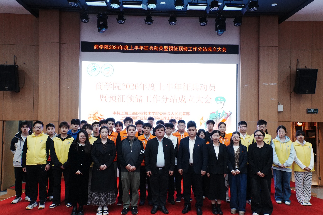 为积极响应国家征兵号召,激发广大学子投身国防、报效祖国的热情,扎实推进学院征兵工作,上海工商职业技术学院商学院于2025年11月12日下午在青浦校区报告厅举行2026年度上半年征兵动员暨预征预储工作分站成立大会。商学院党总支书记陈其、党总支副书记侍现龙、学校征兵宣教组组长张敏、学院征兵工作分站站长兼预征预储工作分站站长田园、全体辅导员及有志参军学子齐聚一堂,共同见证了这一重要时刻。