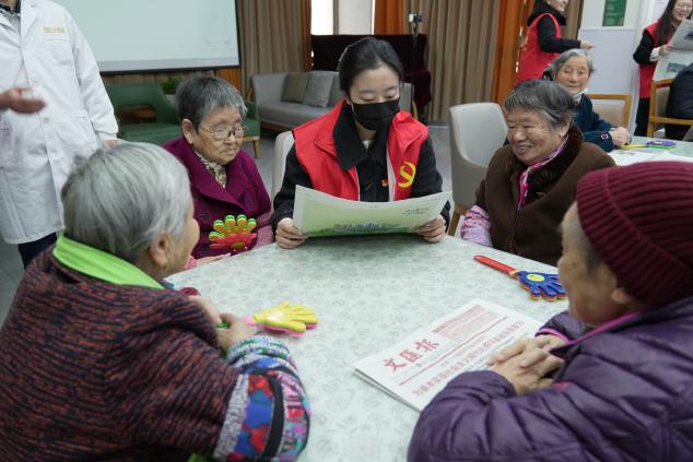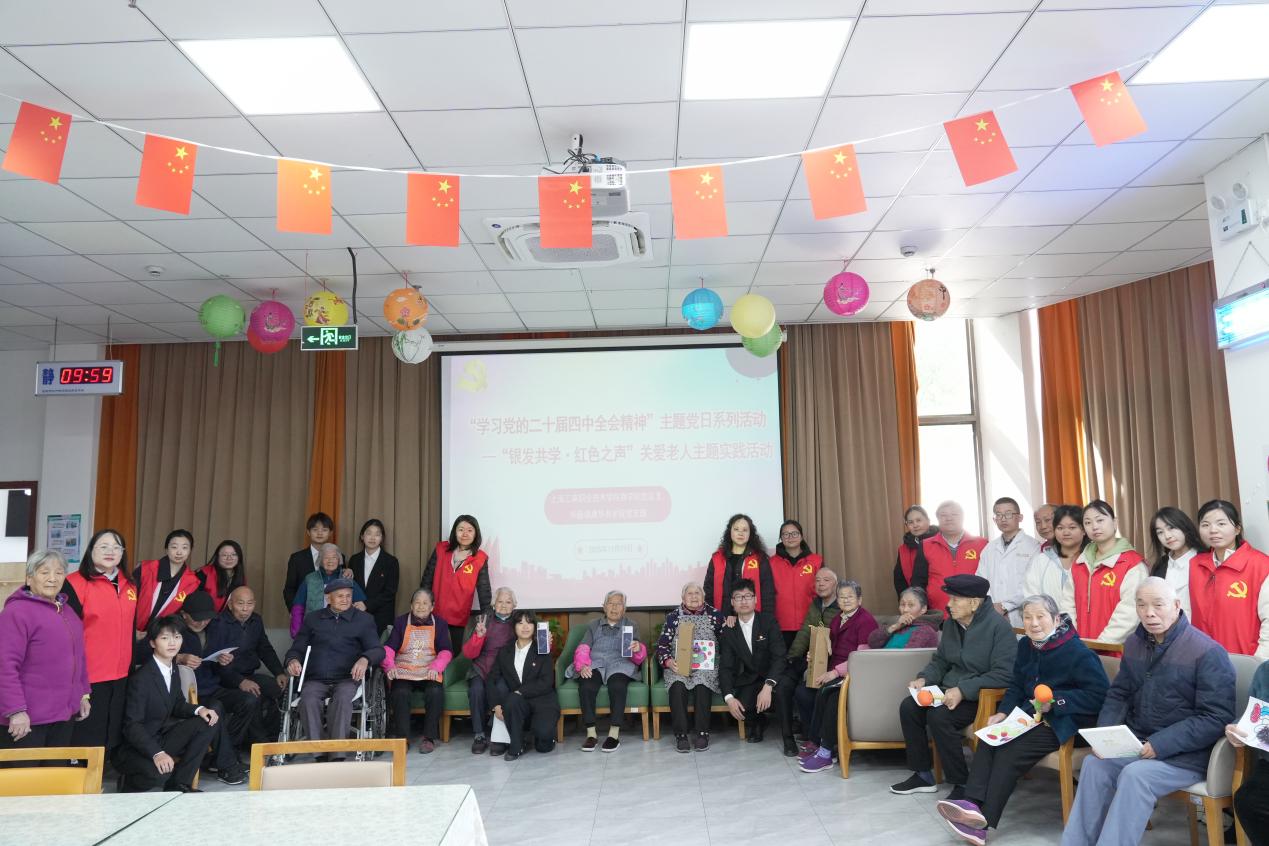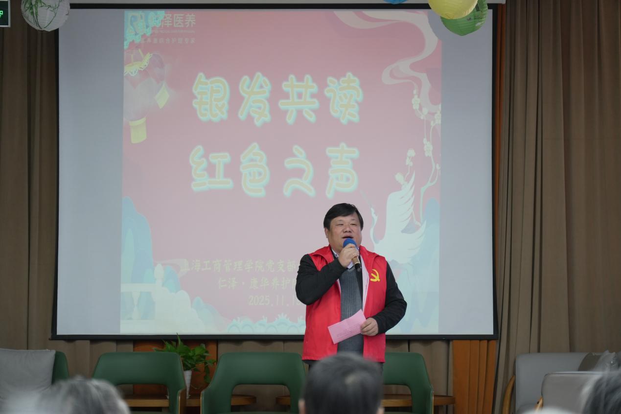 为深入学习宣传贯彻党的二十届四中全会精神,弘扬中华民族尊老敬老爱老的传统美德,上海工商职业技术学院商学院党员教师与学生入党积极分子走进仁泽康华养护院,联合仁泽康华养护院党支部共同举办了“银发共读·红色之声”志愿服务活动。活动由商学院党总支书记陈其主持。通过党员教师、学生入党积极分子与老年群体的互动交流,将党的二十届四中全会精神以生动形式传递给养护院的老人们,同时关注他们的精神文化生活,营造代际和谐、社会关爱的良好氛围。