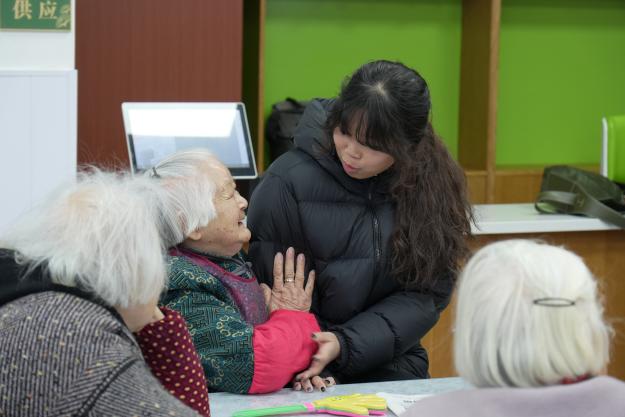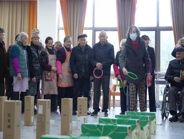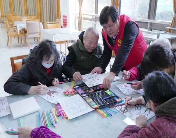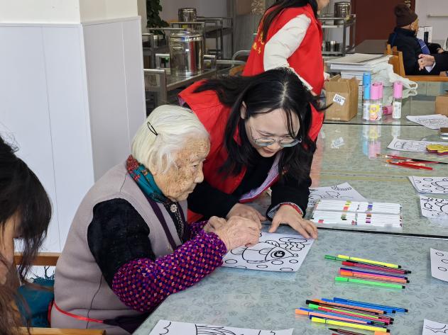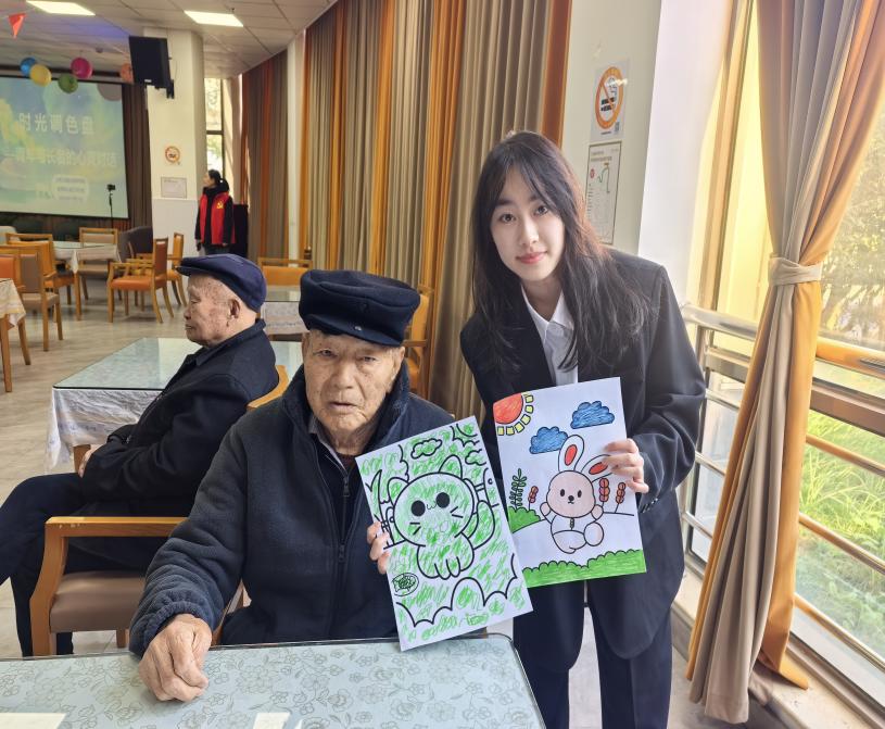 在共读学习环节之后,活动进入了轻松愉快的“心灵驿站”乐享时光。商学院师生与养护院工作人员一同精心布置了活动区域,设置了趣味套圈和创意绘画等互动游戏。在套圈活动区,老人们表现出浓厚的兴趣与专注,他们认真瞄准、稳健投掷,每一次成功的套中都赢得了热烈的掌声与喝彩,现场气氛热烈非凡。在绘画区域,老人们拿起五彩画笔,在志愿者们的陪伴下,自由地在画纸上描绘心中的美好图景,有的画出记忆中的田园风光,有的绘出对未来的灿烂憧憬。这些活动不仅锻炼了老人们的手眼协调能力,更激发了他们的创造力和 生活热情,欢声笑语充盈着整个养护院。师生们还借此机会与老人们亲切交谈,倾听他们的心声,给予温暖的陪伴和精神慰藉。