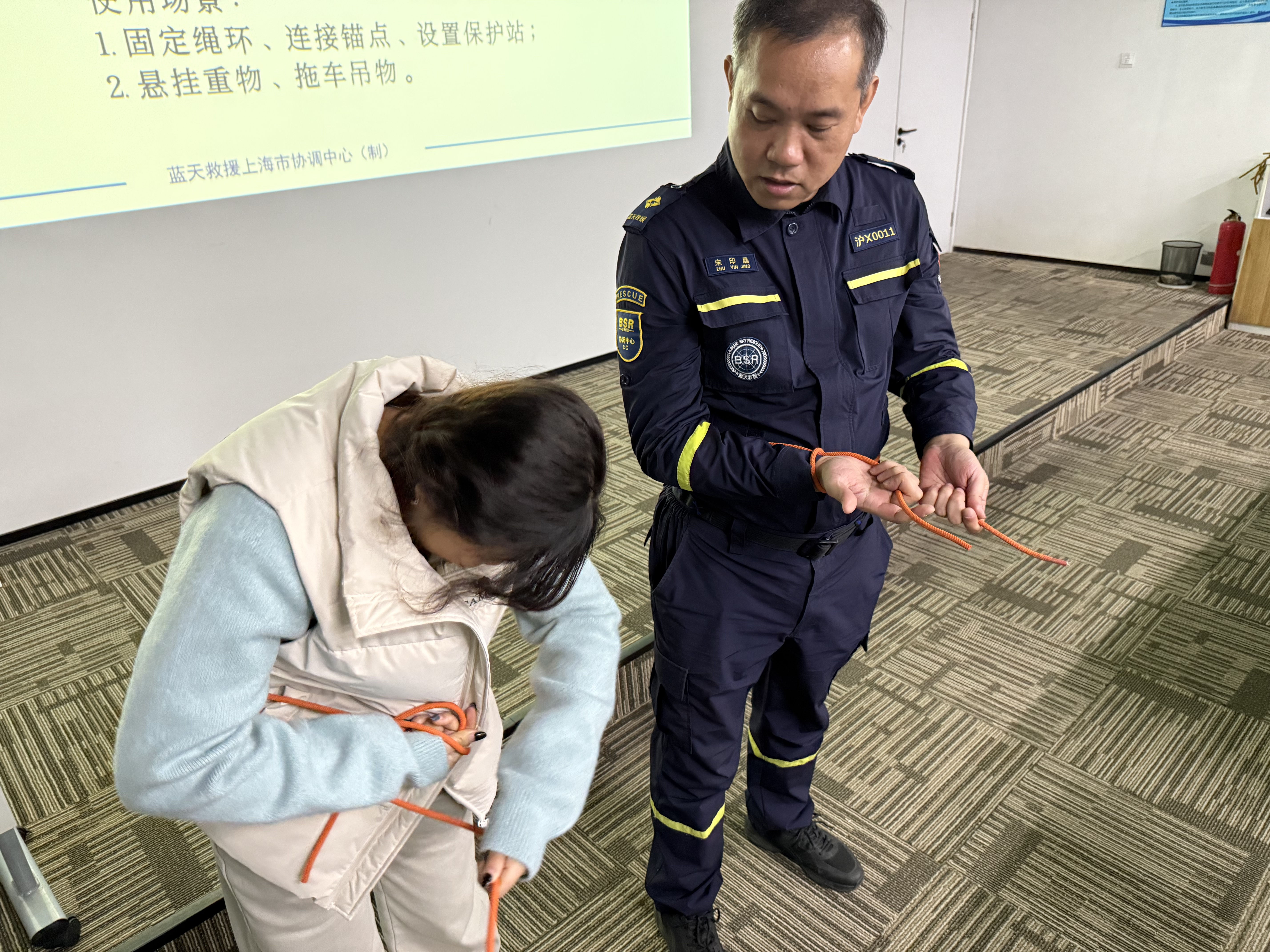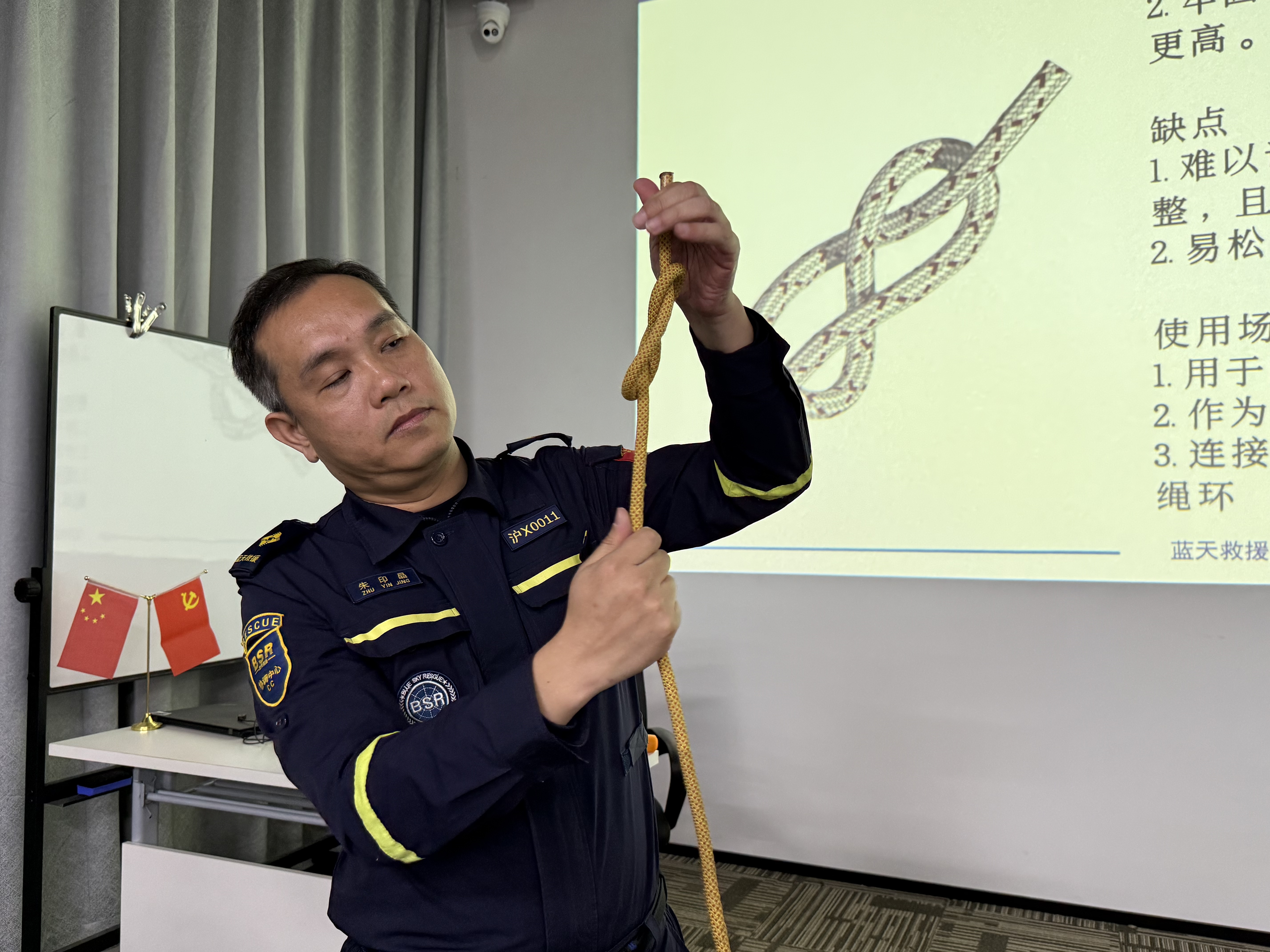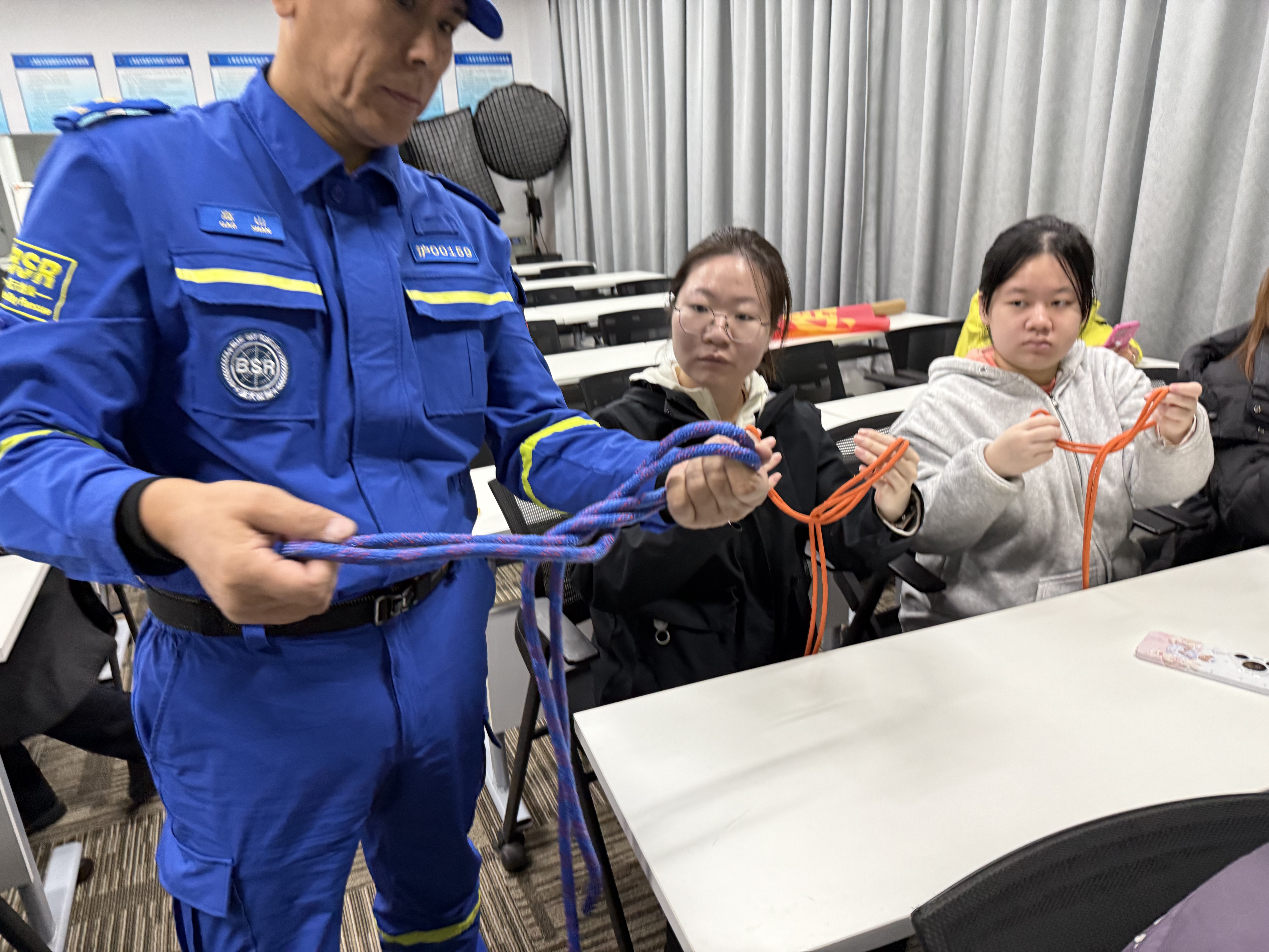 在技能实操环节,救援队员重点演示并指导了多种应急救援中实用的绳索打结方法。从简单的止索结到复杂的锚点固定,队员们细致讲解每种绳结的应用场景与操作要领。同学们认真聆听,踊跃动手尝试,在反复练习中深刻体会到这些关键技能在实战中对于保障生命安全的重要性。